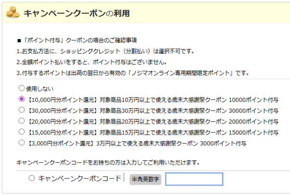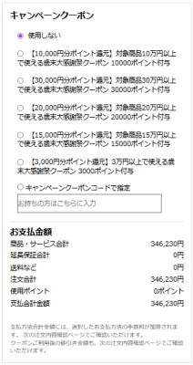 - 次のお支払い方法をご利用の場合、本キャンペーンは対象外となります。【分割払い・全額ポイント払い】