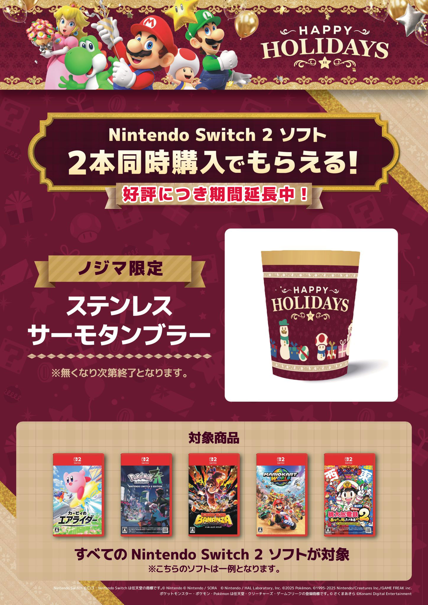 ノジマオンラインにて『Nintendo Switch2』対象ソフト2本を同時購入いただくと、ノジマ限定オリジナルグッズをプレゼント!