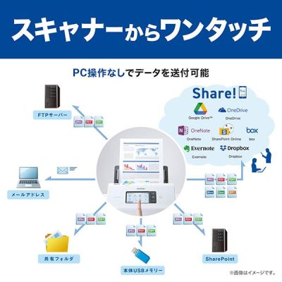スキャンデータを「Google Drive」、「OneDrive」、「Dropbox」、「SugarSync」の各種クラウドサービスに転送できスマートフォンやタブレット端末など多彩なデバイスで幅広く活用できます。