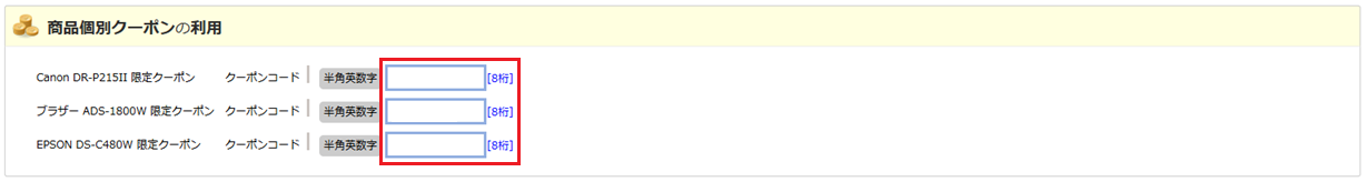各商品に使える対象のクーポンコードをご入力のうえ、